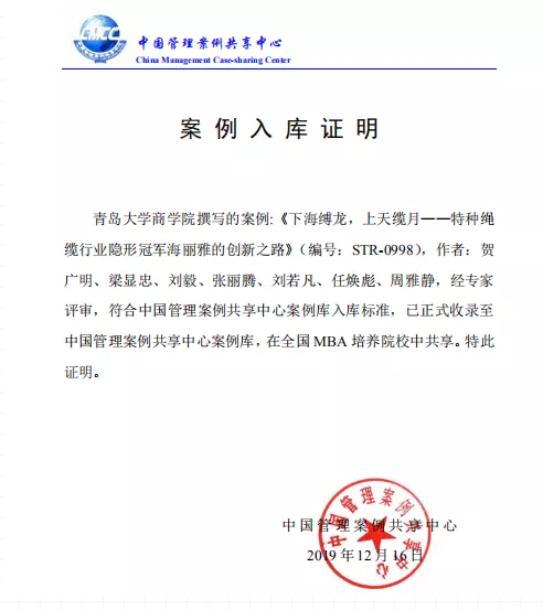 青島海麗雅集團(tuán)·華凱海洋科技有限公司堅(jiān)持走“專、精、特、新”的發(fā)展戰(zhàn)略,通過(guò)國(guó)際領(lǐng)先的產(chǎn)品開(kāi)發(fā)水平和技術(shù)創(chuàng)新能力,堅(jiān)持產(chǎn)品品質(zhì)戰(zhàn)略,不斷提高自身核心競(jìng)爭(zhēng)力,成為代表中國(guó)特種繩纜行業(yè)走向世界的領(lǐng)軍企業(yè)。2018年,公司作為特種繩纜行業(yè)隱形冠軍的典型學(xué)術(shù)研究案例,入選浙江大學(xué)“隱形冠軍”國(guó)際研討會(huì)。2019年,該案例入選“中國(guó)管理案例共享中心案例庫(kù)”,在全國(guó)高校MBA教育課程中共享。