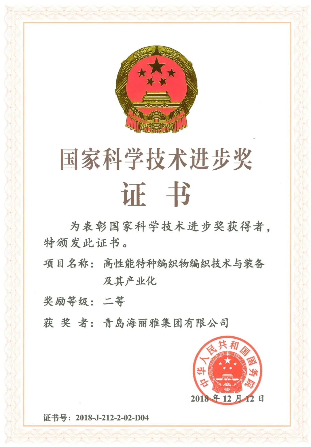 青島海麗雅集團(tuán)·華凱海洋科技有限公司研發(fā)的“高性能特種編織物編織技術(shù)” 斬獲國(guó)家科技進(jìn)步獎(jiǎng)二等獎(jiǎng)。