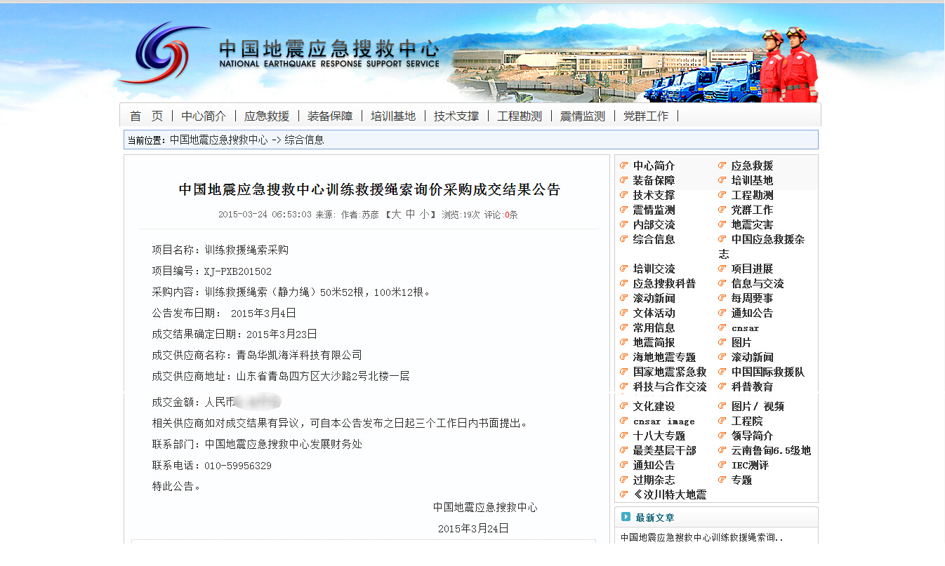 3月24日,青島華凱海洋科技有限公司傳來捷報,公司憑借良好的信譽和過硬的技術(shù),從國內(nèi)外9家投標方中脫穎而出,成為中國地震應(yīng)急搜救中心供應(yīng)商。此次中標意味著中國地震應(yīng)急搜救中心下屬中國國際救援隊及國家地震緊急救援訓(xùn)練基地首次應(yīng)用國產(chǎn)訓(xùn)練救援用繩。