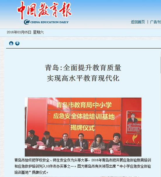 2016年青島市把開(kāi)展中小學(xué)生應(yīng)急體驗(yàn)教育培訓(xùn)和市民應(yīng)急救護(hù)培訓(xùn)列入10件市辦實(shí)事,未來(lái)海麗雅應(yīng)急安全教育培訓(xùn)中心將為更多的學(xué)生、百姓提供專業(yè)化應(yīng)急安全教育培訓(xùn)服務(wù),為提升社會(huì)整體應(yīng)急自救、互救技能水平貢獻(xiàn)力量。《中國(guó)教育報(bào)》關(guān)注青島市應(yīng)急教育的發(fā)展,在全國(guó)“兩會(huì)”期間,第一時(shí)間將“青島市教育局中小學(xué)應(yīng)急安全體驗(yàn)培訓(xùn)基地”落戶海麗雅應(yīng)急安全教育培訓(xùn)中心消息進(jìn)行宣傳報(bào)道。