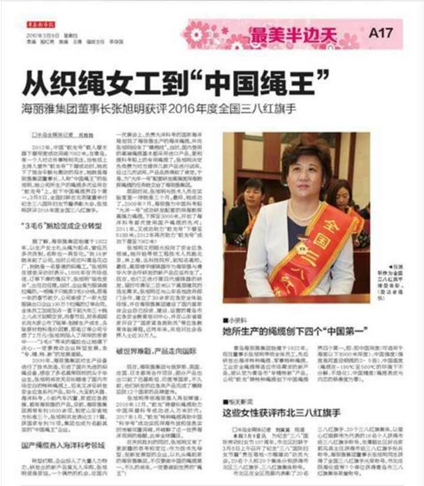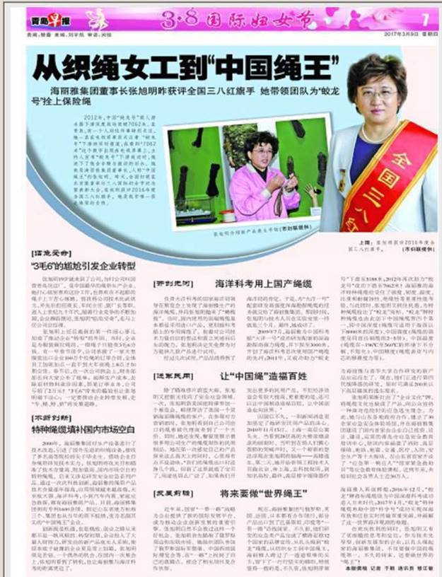 “業(yè)精于勤,荒于嬉;行成于思,毀于隨”,用在張旭明身上最貼切。36年的光陰,張旭明毫不吝嗇的奉獻(xiàn)給海麗雅,從織繩女工到“中國(guó)繩王”,這背后砥礪前行的痛楚也只有她自己最清楚。但是,路漫漫其修遠(yuǎn)兮,張旭明會(huì)一直秉持“大國(guó)匠心”的理念,將繩纜產(chǎn)業(yè)做到極致,要讓自己的繩纜走出國(guó)門,站在世界的舞臺(tái)上,為國(guó)爭(zhēng)光!