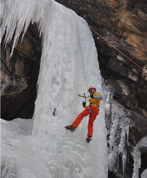 圖為:公司研發(fā)生產(chǎn)的“蛟龍”登山繩助力“雪山之吻”登山隊(duì)征服水簾洞冰壁