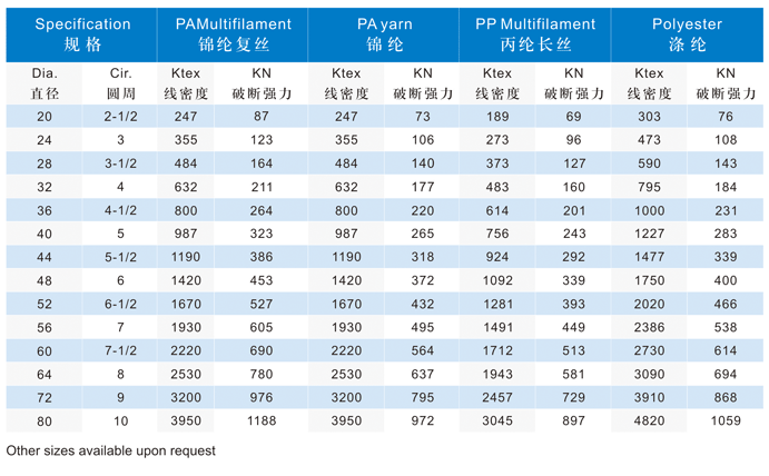 十六股繩規(guī)格有錦綸復(fù)絲、丙綸長(zhǎng)絲、滌綸等系列產(chǎn)品。從國(guó)外引進(jìn)的十六股編織機(jī)填補(bǔ)了國(guó)內(nèi)制繩行業(yè)的空白,特殊的編織結(jié)構(gòu)和工藝,顯著的提高了纖維強(qiáng)力利用率,使繩索具有伸長(zhǎng)低、耐磨損、耐腐蝕、柔軟光滑、便于操作等優(yōu)點(diǎn),為用戶的特殊需求提供理想的產(chǎn)品。