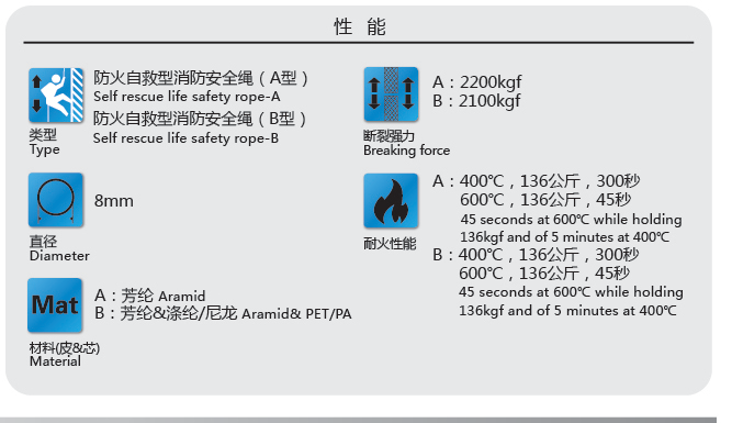 防火逃生繩斷裂強度大于2000kgf,低延伸率,特殊防火設(shè)計,400℃,136公斤,300秒;600℃,136公斤,45秒不出現(xiàn)斷裂現(xiàn)象。適用于消防、救援、火災(zāi)逃生、高溫環(huán)境作業(yè)等。
